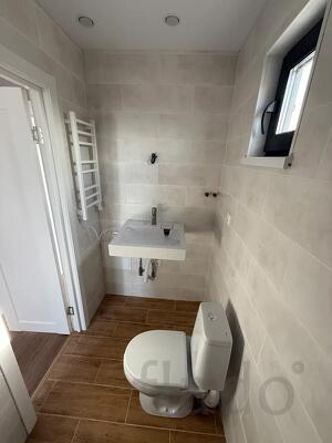 • Санузел: Плитка Cersanit Lasvik + теплый пол. Вся сантехника (унитаз Sanita Luxe, раковина, полотенцесушитель) — установлены.