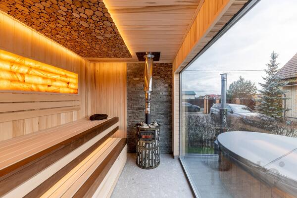 • Отделка: стены в комнате отдыха - амбарная доска, стены в парной - вагонка из липы; пол - керамогранит, потолок - натяжной со спотами