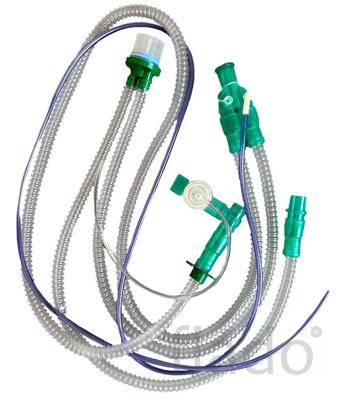 Дыхательный контур для искусственной вентиляции лёгких, педиатрический гладкоствольный, армированный, ПВХ, реверсивный (2-х патрубочный), порт на Y-обр. тройнике, диаметр 15 мм, длина 180 см, линия мониторинга 200 см, клапан выдоха 2х ходовой, влагосборник 1 шт, для аппарата ивл Puritan Bennett 560.