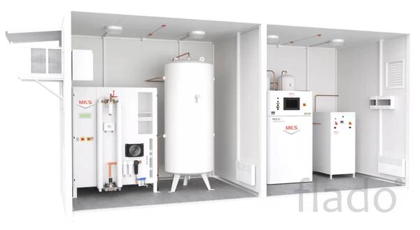 Для производства медицинского кислорода вне зданий служит кислородный контейнер. Может быть исполнен в виде контейнера из сэндвич-панелей или изготовлен в морском контейнере при необходимости перемещения. Контейнер имеет два отделения с отдельными входами: одно для подачи воздуха и одно для производства кислорода.