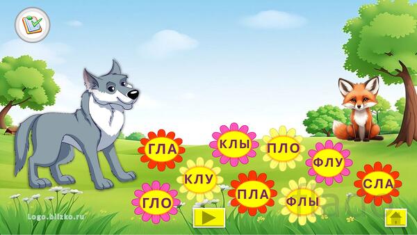 Ребенок, играя, выполняет необходимые шаги (например, помоги волку собрать букет цветов для лисы и др.), проговаривая слоги, тем самым звук закрепляется, автоматизируется. Взрослый контролирует правильность произнесения звука. При необходимости можно выйти в главное меню и повторить любое из упражнений сначала. Можно последовательно идти по слайдам.