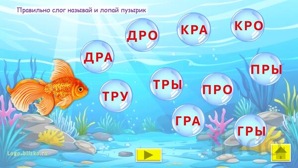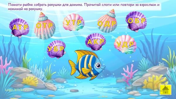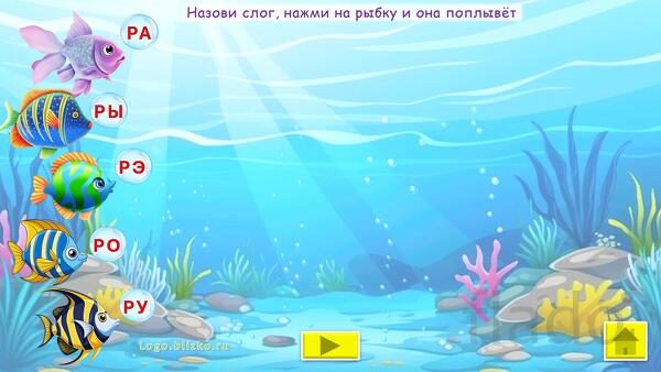 Ребенок, играя, выполняет необходимые шаги (например, помогает рыбке отправиться в плавание и др.), проговаривая слоги, тем самым звук закрепляется, автоматизируется. Взрослый контролирует правильность произнесения звука. При необходимости можно выйти в главное меню и повторить любое из упражнений сначала. Можно последовательно идти по слайдам.