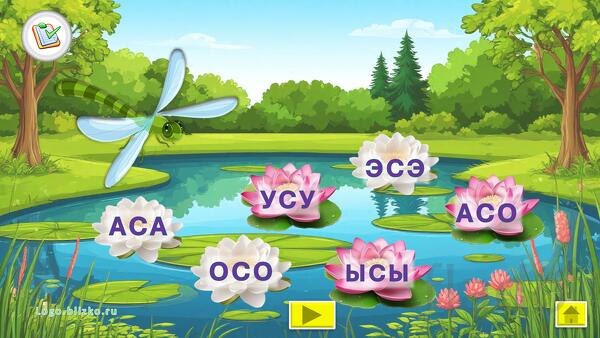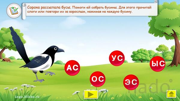 Ребенок, играя, выполняет необходимые шаги (например, помогает сороке собрать бусы, помогает стрекозе найти очки и др.), проговаривая слоги, тем самым звук закрепляется, автоматизируется. Взрослый контролирует правильность произнесения звука. При необходимости можно выйти в главное меню и повторить любое из упражнений сначала. Можно последовательно идти по слайдам.