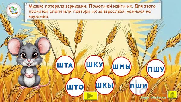 Ребенок, играя, выполняет необходимые шаги (например, помогает мишке собрать малину и др.), проговаривая слоги, тем самым звук закрепляется, автоматизируется. Взрослый контролирует правильность произнесения звука. При необходимости можно выйти в главное меню и повторить любое из упражнений сначала. Можно последовательно идти по слайдам.