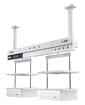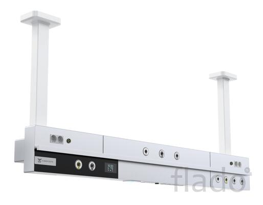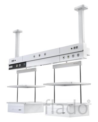 Дополнительно возможно размещение кареток и кронштейнов с различными типами рабочих станций с полками и ящиками для установки дополнительного медицинского оборудования и инструментов с функцией фиксации возле кровати или кушетки пациента, что обеспечивает удобный доступ для проведения разнообразных медицинских манипуляций, таких как операции, процедуры и лечение.