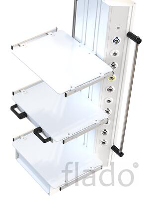Для удобства медицинского персонала, газовые клапаны стандарта DIN 13260-2 размещены с одной стороны корпуса, а электрические и слаботочные розетки – с другой. Наличие центральной подвижной площадки позволяет устанавливать индивидуальное крепление анестезиологического аппарата, а для удобного размещения вспомогательного медицинского оборудования на шкафу можно расположить от 1 до 4 полок различных модификаций, при этом полки могут оснащаться медицинскими рельсами или выдвижными ящиками.