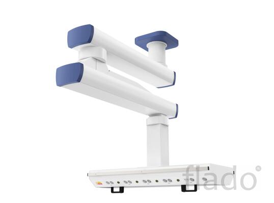 Медицинская потолочная двухплечевая консоль Кадуцей (Caduceus) C2E-A с одним поворотным плечом длиной до 1200 мм, одним поворотно-подъемным плечом длиной 900 мм и вращающимся горизонтальным шкафом источников медгазов и электропитания – идеальное решение для организации функционального и эргономичного рабочего места медицинского персонала в операционных и реанимационных отделениях, родовых залах, а также палатах интенсивной терапии. Мобильность подвесной многофункциональной системы CADUCEUS (Кадуцей) обеспечивает возможность быстрого подключения пациента к системе медицинского газоснабжения и коммутации необходимого медицинского оборудования для проведения оперативных и восстановительных мероприятий. Для крепления дополнительного оборудования шкаф источников медгазов и электропитания оснащается медицинскими рельсами с несущей способностью каждого до 25 кг.