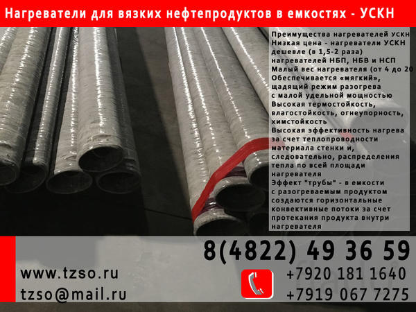 Назначение. Универсальный стеклокомпозитный нагреватель (УСКН) предназначен для разогрева и поддержания температуры вязких нефтепродуктов, битума, гудрона, мазута, масла, агрессивных диэлектрических сред в емкостях, хранилищах, цистернах, различных резервуарах, а также воздушных и невзрывоопасных газовых сред.